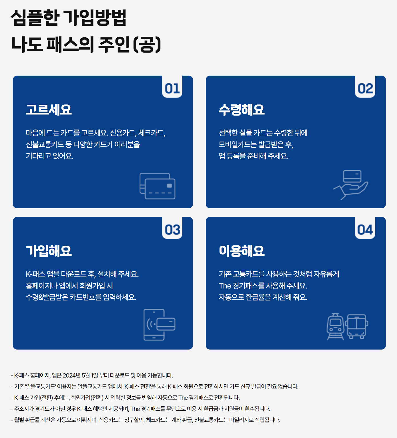 반드시 5월 1일부터 K-패스 홈페이지 또는 앱에 회원가입을 하셔야 하며, 기존 알뜰교통카드 회원은
