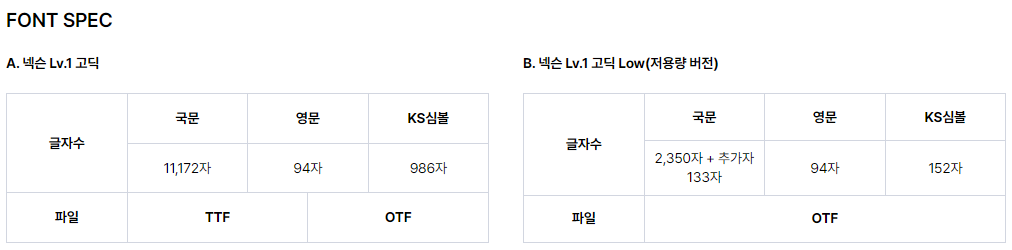 온/오프라인 적용에 구애받지 않고, 젊고 귀여운 넥슨 Lv.1 고딕보다 성숙하고 어른스러운 느낌의 서체.