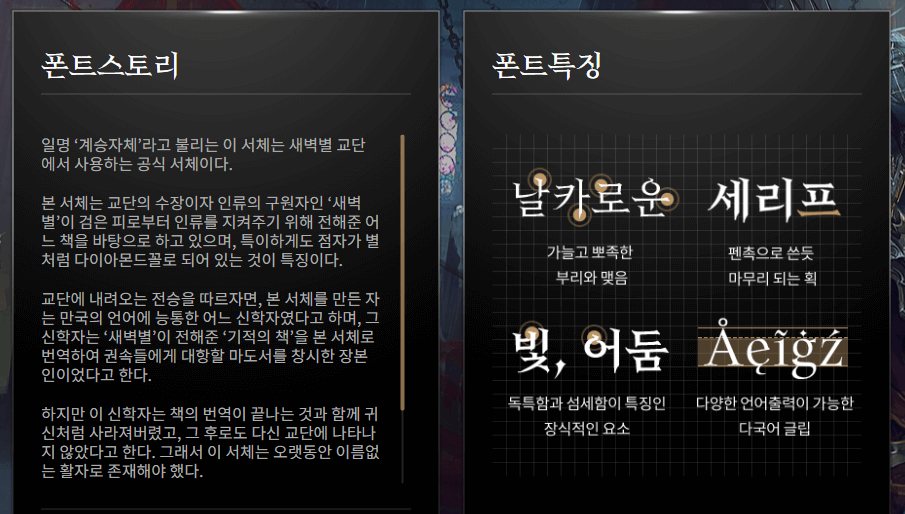 가독성 좋은 본문용 글꼴로서 다양한 게임들을 아우르며 모바일, 웹, 인쇄 등 다양한 매체 사용에 무리 없도록 제작.