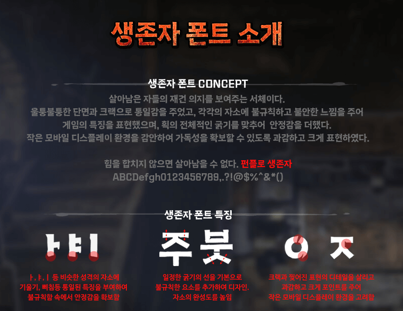 가독성 좋은 본문용 글꼴로서 다양한 게임들을 아우르며 모바일, 웹, 인쇄 등 다양한 매체 사용에 무리 없도록 제작.