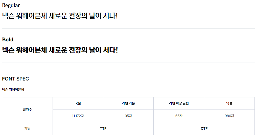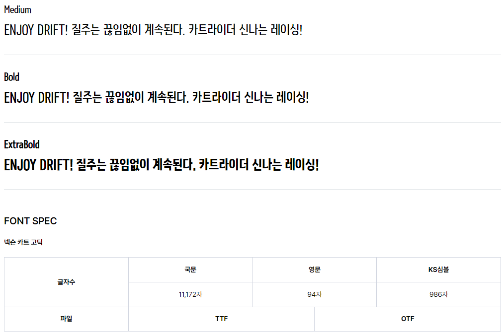 온/오프라인 적용에 구애받지 않고, 젊고 귀여운 넥슨 Lv.1 고딕보다 성숙하고 어른스러운 느낌의 서체.