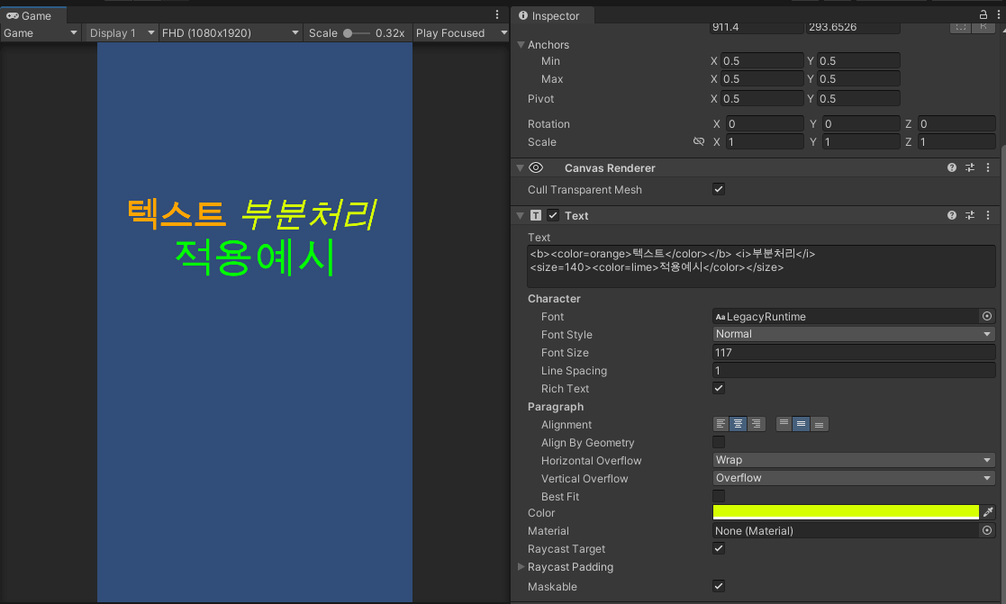 유니티의 텍스트를 사용할 때 특정 텍스트를 두껍게 강조하거나, 특정 단어만 색상을 변경하는 등 텍스트의 부준 지정 형식을 지원하는 기능입니다.